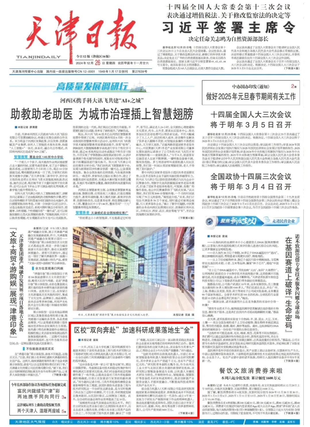 12月26日,《天津日?qǐng)?bào)》頭版以《區(qū)?!半p向奔赴”加速科研成果落地生“金”》為題報(bào)道,由河北工業(yè)大學(xué)與北辰區(qū)聯(lián)合共建的新型研發(fā)機(jī)構(gòu)的技術(shù)研發(fā)和成果轉(zhuǎn)化,為推進(jìn)創(chuàng)新鏈產(chǎn)業(yè)鏈資金鏈人才鏈深度融合,不斷提高科技成果轉(zhuǎn)化和產(chǎn)業(yè)化水平的區(qū)?!半p向奔赴”案例。為加快特種機(jī)器人和人工智能融合,并積極布局新行業(yè)領(lǐng)域,加速科研成果落地生“金”,為服務(wù)地方經(jīng)濟(jì)發(fā)展提供了新動(dòng)能。